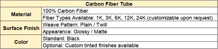 Carbon Fiber Tube is a lightweight carbon fiber-resin part, an ideal alternative to traditional tubes for high-end manufacturing. It features ultra-light weight (1.5-1.8g/cm³), high strength (3000-5000MPa), corrosion resistance, stability, customizability, easy processing and eco-friendliness. Used in aerospace (UAV), new energy vehicles, robots, sports, etc., we offer ISO9001-qualified products with test reports and after-sales service.